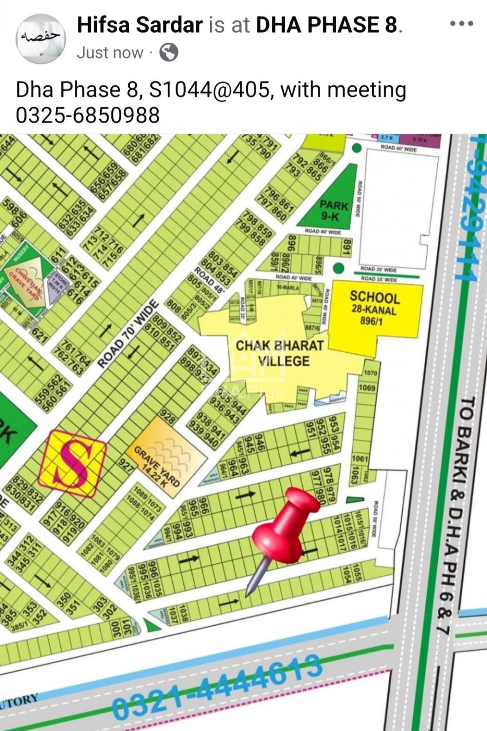 Dha Phase 8 S1044@405, with meeting Summary: Location: Sector S, Phase 8, Lahore Size: 1 Kanal Purpose: For Sale Category: Plot Price: PKR: 405 Lakh