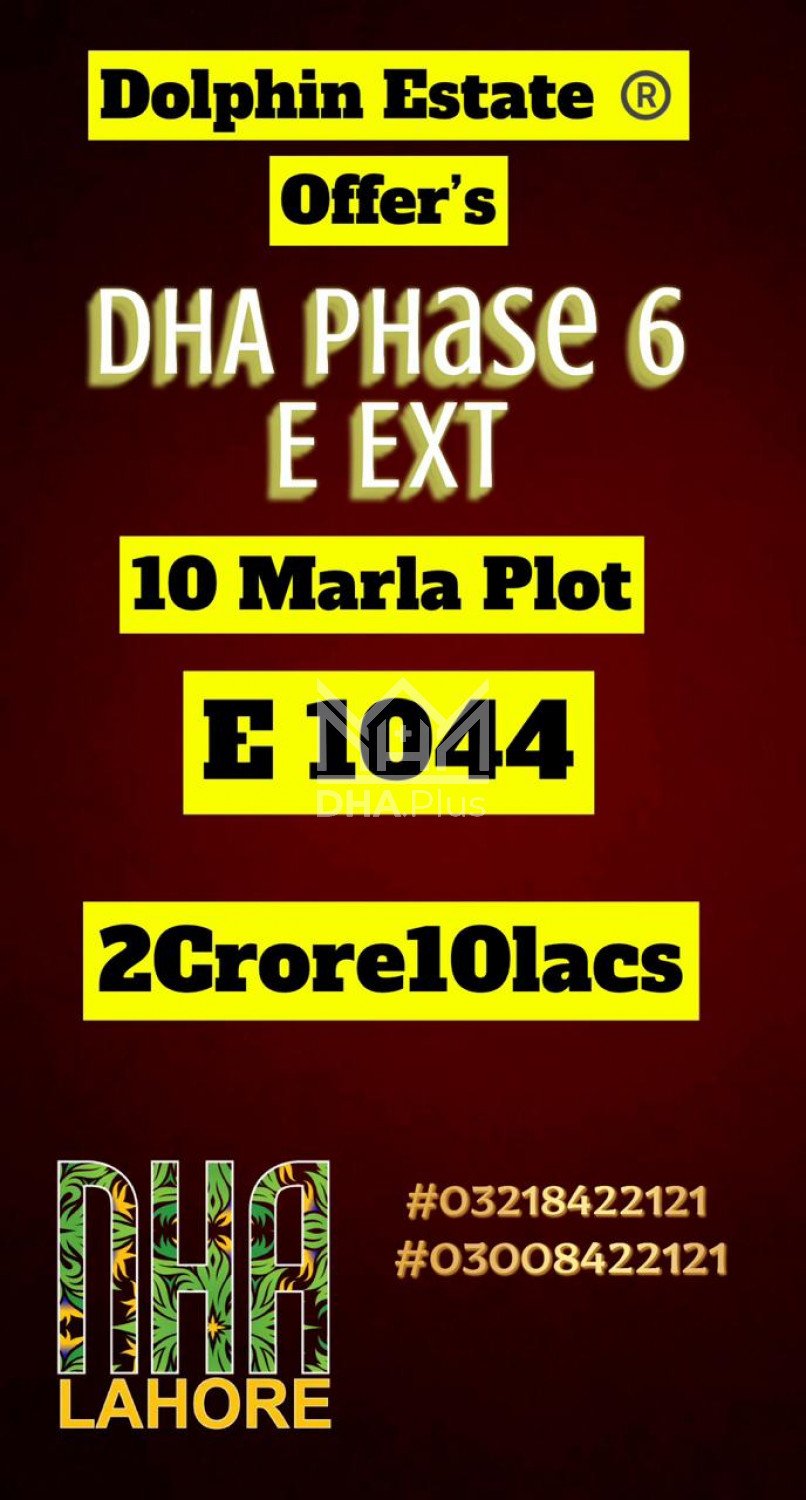 Dolphin Real estate offers 10-Marla Plot E-1044 back of 70"Feet Road Next to Corner 210 Lac Summary: Location: Sector E, Phase 6, Lahore Size: 10 Marla Purpose: For Sale Category: Plot Price: PKR: 210 Lakh
