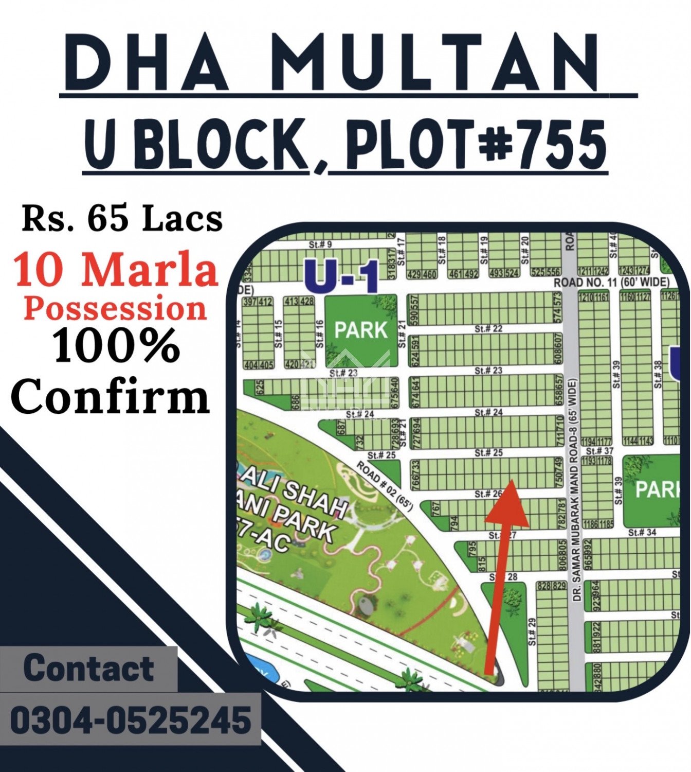 DHA Multan U Block 10 Marla hit location for sale Summary: Location: Sector U, DHA Multan, Multan Size: 10 Marla Purpose: For Sale Category: Plot Price: PKR: 65 Lakh