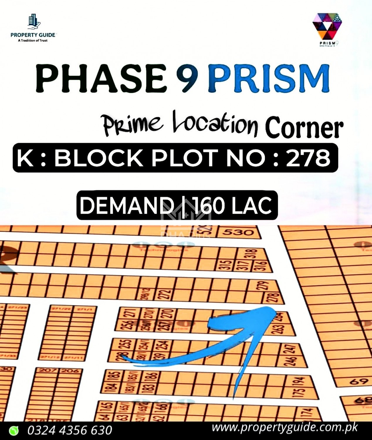 k 278@160 corner Possession Plot 03244356630 Summary: Location: Sector K, Phase 9 Prism, Lahore Size: 10 Marla Purpose: For Sale Category: Plot Price: PKR: 160 Lakh
