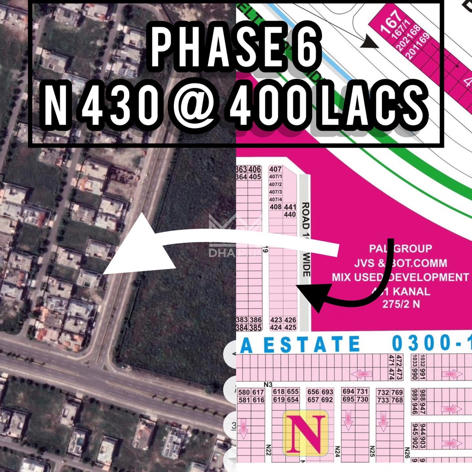 E 231+32 @ 10 crores N 430 @ 400 Lacs 100ft rd L 902 @ 480 Near to Park Summary: Location: Sector E, Phase 6, Lahore Size: 2 Kanal Purpose: For Sale Category: Plot Price: PKR: 1000 Cror