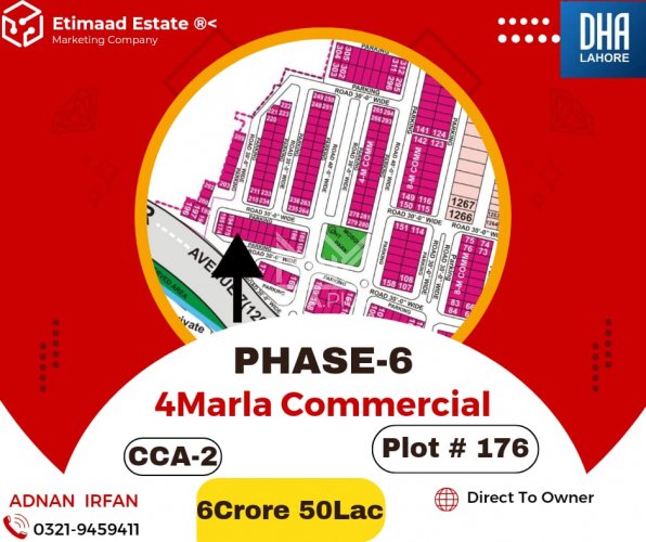 Commercial Plot For Sale Plot number 176 Summary: Location: Sector CC2 Commercial, Phase 6, Lahore Size: 4 Marla Purpose: For Sale Category: Plot Price: PKR: 650 Lakh