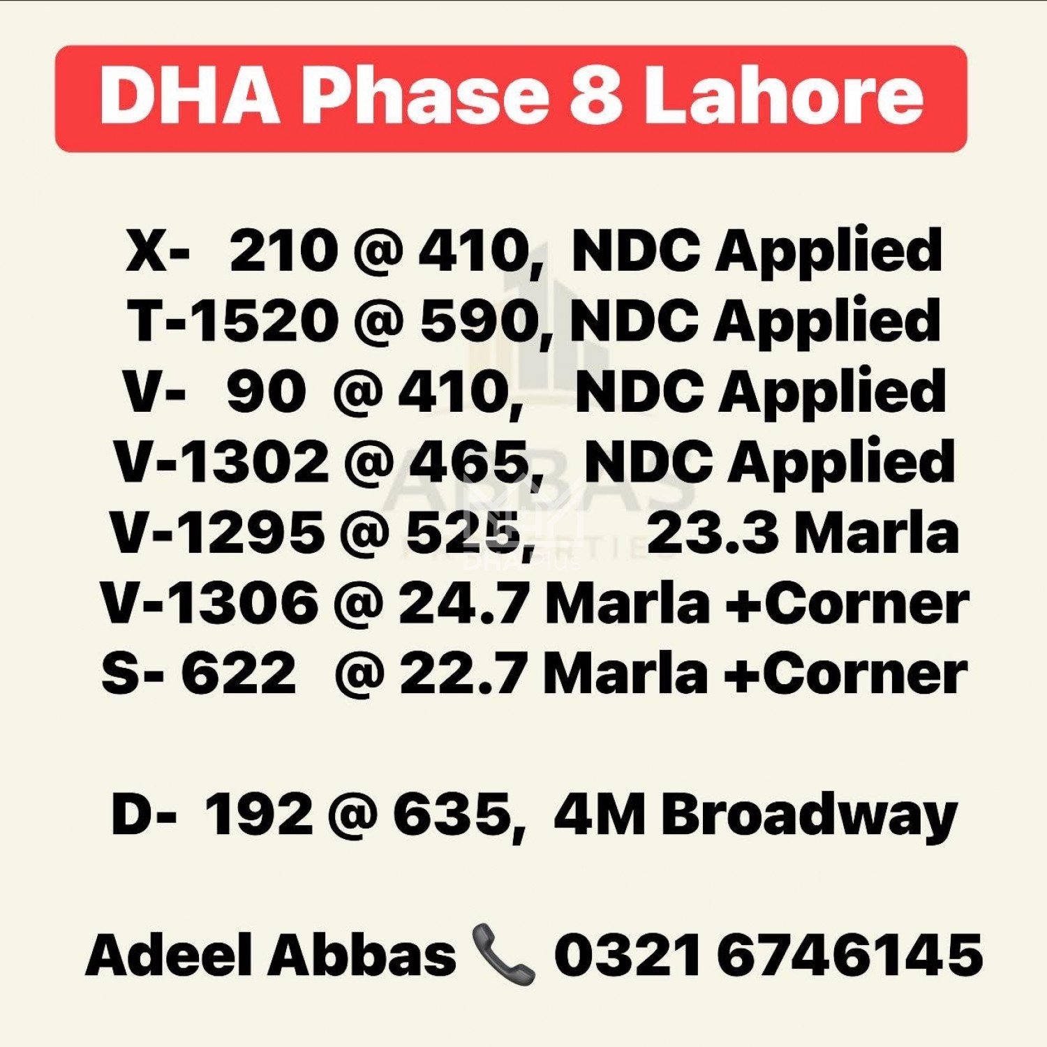 ABBAS PROPERTIES 192-MB, Phase 6, DHA Lahore 03216746145 Summary: Plot Number: 622 Location: Sector S, DHA Phase 8, Lahore Size: 5125 Sq. Feet Purpose: For Sale Category: Plot Price: PKR: 450 Lakh