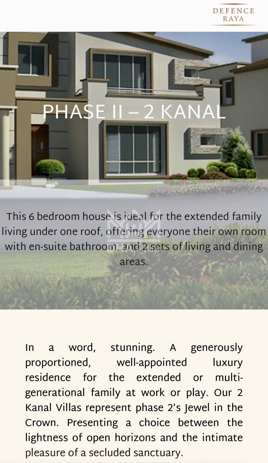 Defence Raya Residential 2Kanal Facing Golf View available for confirmed sale. Summary: Location: Golf Course-Ph II, Phase 6, Lahore Size: 2 Kanal Purpose: For Sale Category: Villa Price: PKR: 2100 Cror