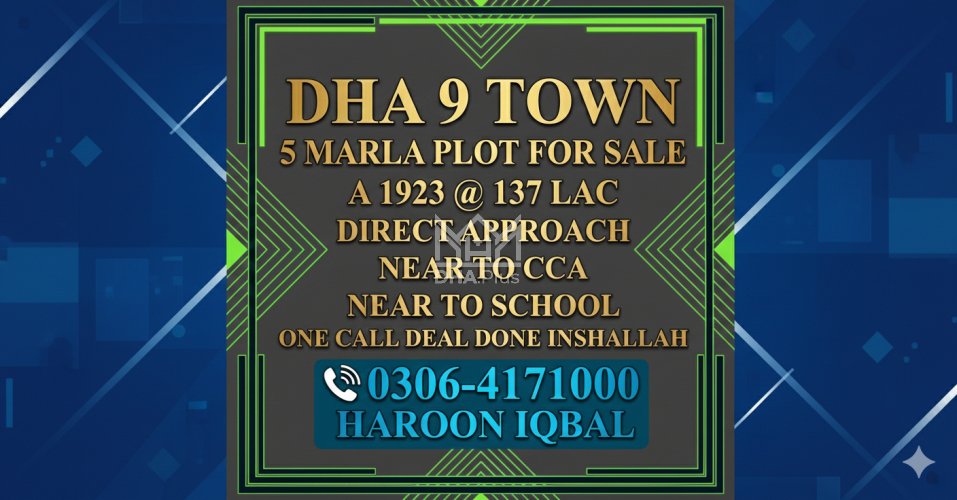 DHA 9 Town 5 MARLA A BLOCK phase 9 near park ?️ Summary: Location: Sector A, Phase 9 Town, Lahore Size: 5 Marla Purpose: For Sale Category: Plot Price: PKR: 104 Lakh