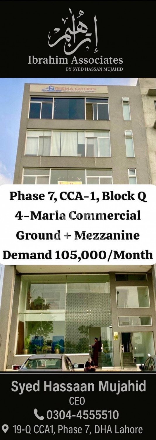 Ibrahim Associates offer 4-Marla Commercial Ground + Mezzanine 105,000/Month Summary: Plot Number: 48 Location: Sector CC1 Commercial, DHA Phase 7, Lahore Size: 4 Marla Purpose: For Rent Category: Ground Floor Price: PKR: 1.05 Lakh