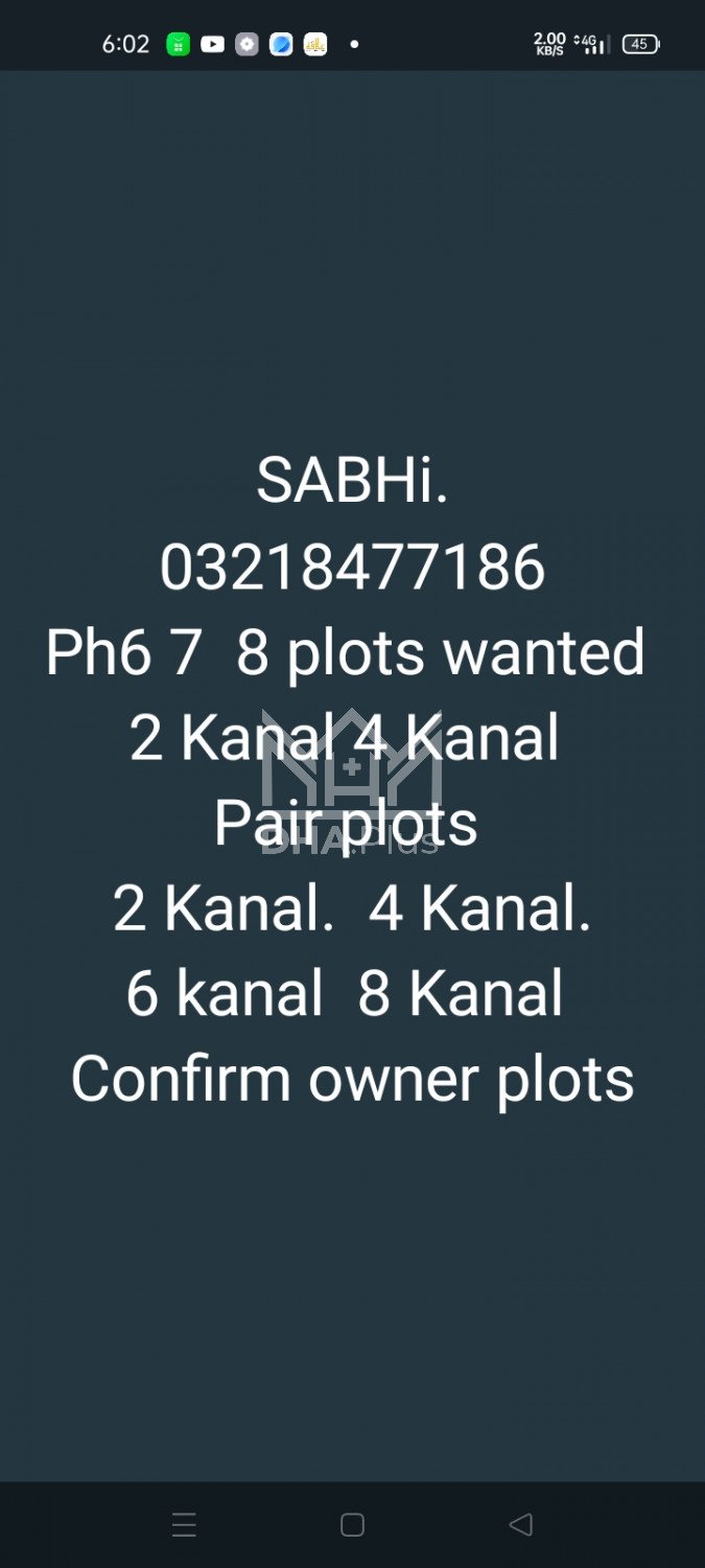 ph 6 7 8 .1 Kanal 2 Kanal 4 Kanal 6+8 Kanal plots wanted owner plots Down payment ph7 6 New House 1+2 Kanal wanted DHA plots new house buy sell investment available