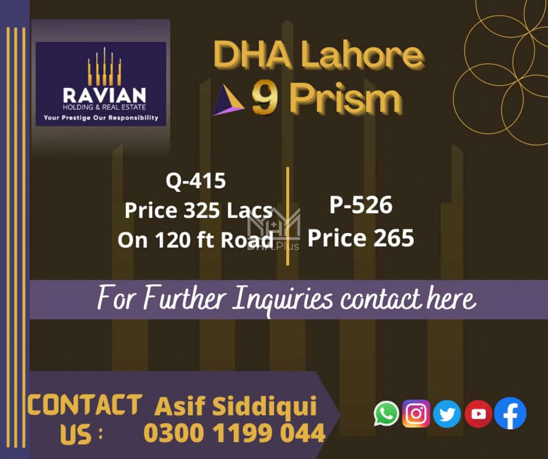 9 Prism Q-415 @325 Additional Paid paper available Summary: Location: Sector Q, Phase 9 Prism, Lahore Size: 1 Kanal Purpose: For Sale Category: Plot Price: PKR: 325 Lakh